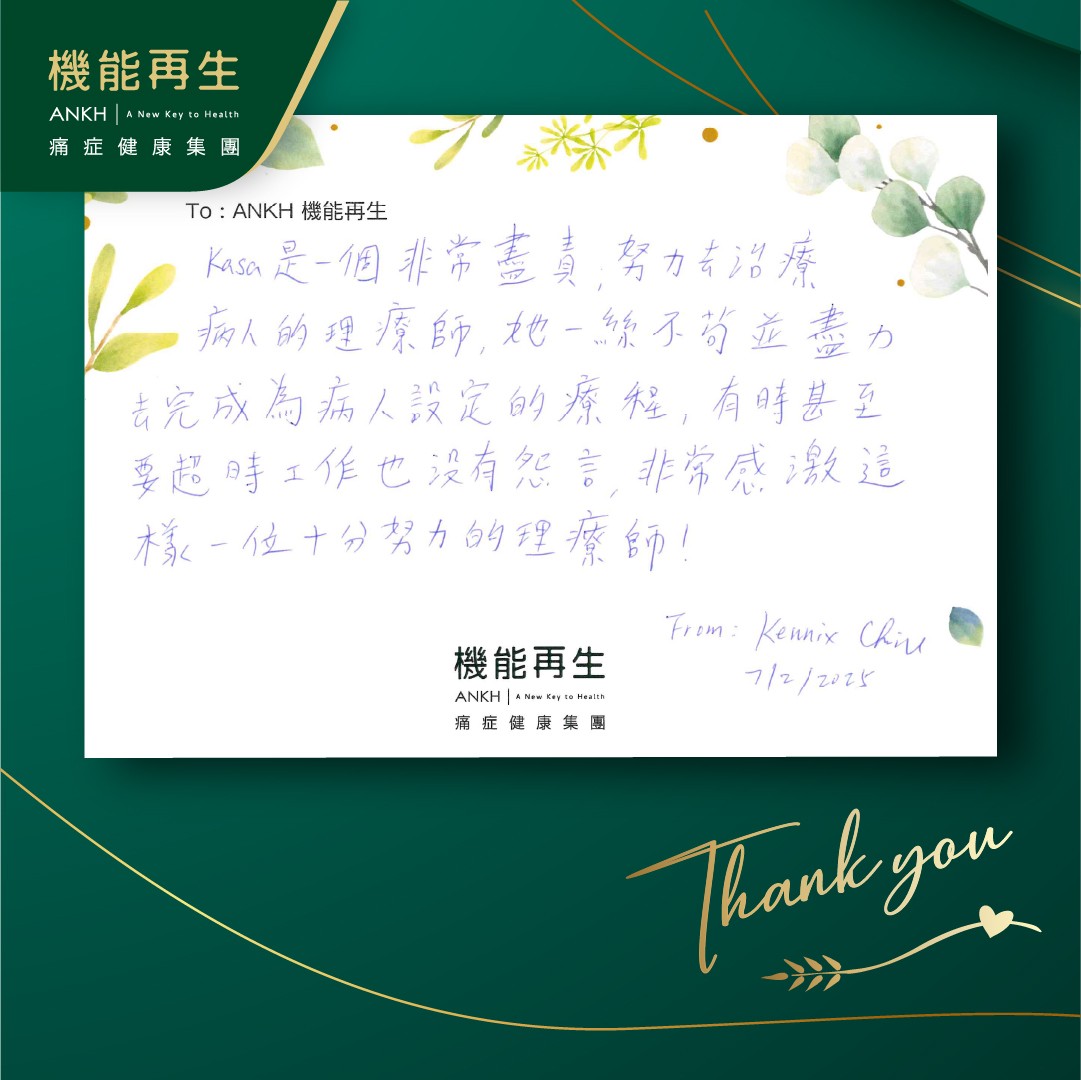 理療師非常盡責,努力為客人理療,她一絲不苟並盡力去完成為客人設定的療程,有時甚至要超時工作也沒有怨言,非常感激這樣一位十分努力的理療師!