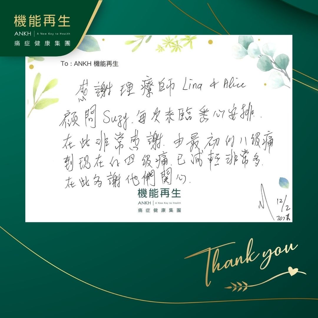 感謝理療師、健康顧問每次來臨悉心安排,在此非常感謝,由最初的八級痛到現在的四級痛,已減輕非常多,在此多謝他們關心。