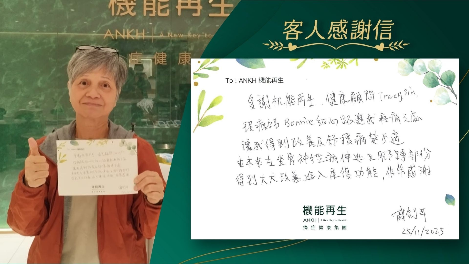 多謝機能再生健康顧問、理療師細心跟進我疼痛之處,讓我得到改善及舒緩痛楚不適。由本來左坐骨痛伸延至腳踭部分,得到大大改善,進入康復功能,非常感謝。