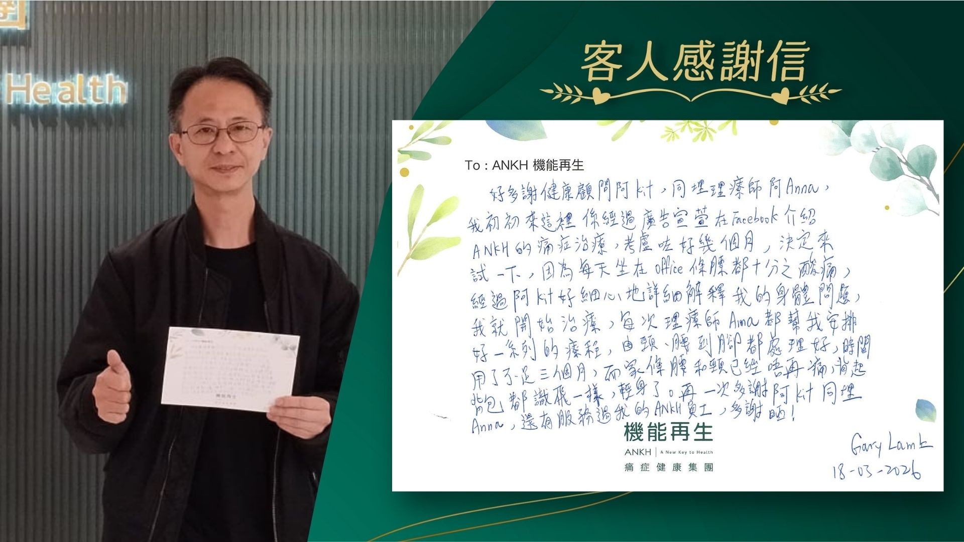 好多謝健康顧問同埋理療師,我初初來這裡係經過宣萱在Facebook介紹,因為每天坐在Office條腰都十分之酸痛,經過健康顧問好細心地詳細解釋我的身體問題,我就開始理療,每次理療師都幫我安排一系列的療程,由頸、腰到腳已經唔再痛,背起背包都識飛一樣,輕身了。再一次多謝健康顧問同埋理療師,還有服務過我的ANKH員工,多謝哂!