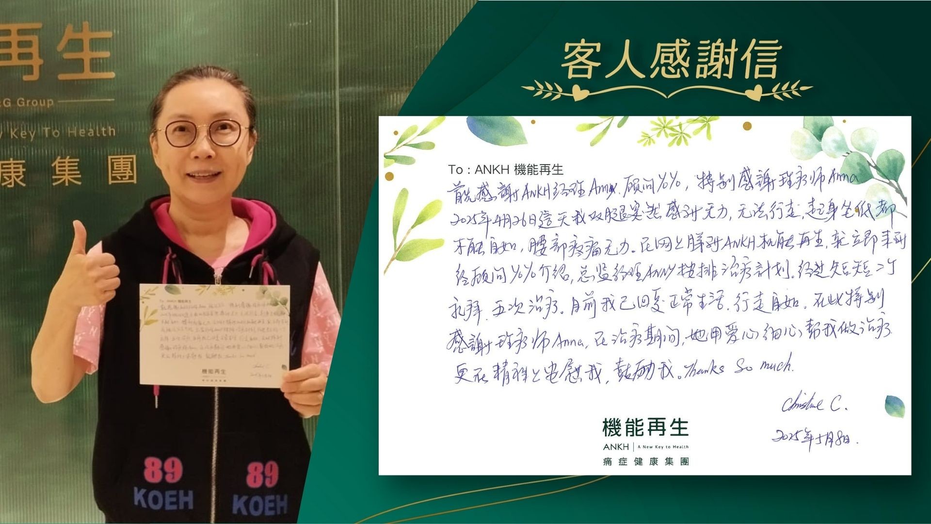 首先感謝ANKH健康顧問,特別感謝理療師2025年4月26日這天我雙腿突然感到無力,無法行走,起身坐低都不能自如,腰部疼痛無力。在網上睇到ANKH機能再生,就立即來到。經健康顧問介紹,總監經理安排理療計劃。經過短短兩個禮拜,五次理療。目前我已回復正常生活,行走自如,在此特別感謝理療師,在理療期間,她用愛心、細心幫我做理療,更在精神上安慰我、鼓勵我。Thanks so much!