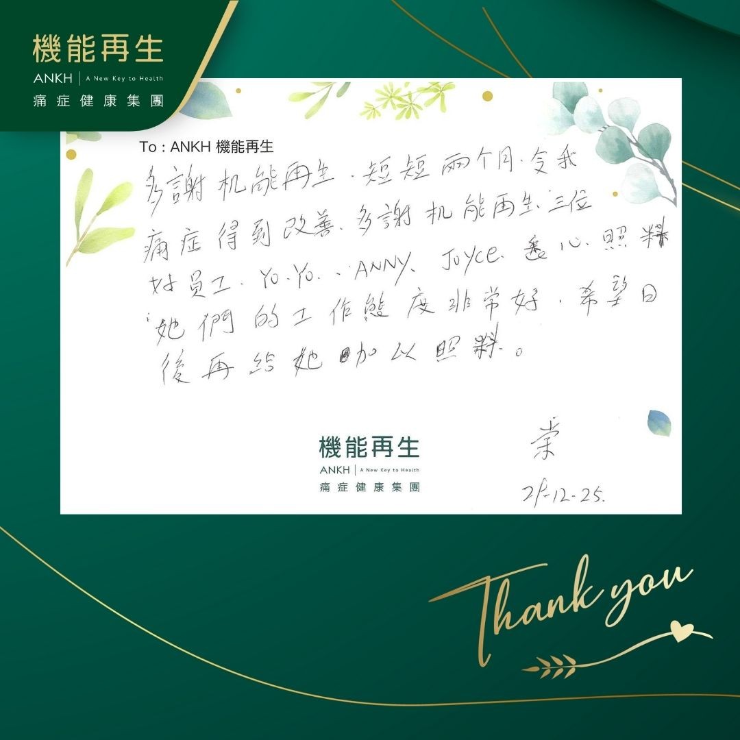 多謝機能再生,短短兩個月令我痛症得到改善,多謝機能再生三位好員工悉心照料。她們的工作態度非常好,希望日後再給她加以照料。