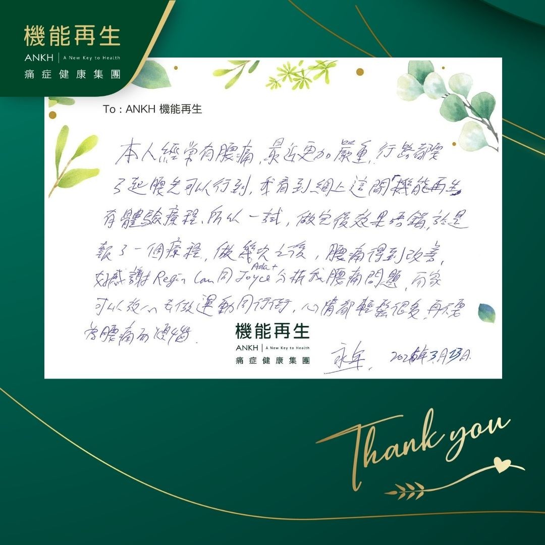本人經常有腰痛,最近更加嚴重,行路都要弓起腰先可以行到,我看到網上這間「機能再生」有體驗療程,所以一試,做完後效果唔錯,於是報了一個療程,做幾次之後,腰痛得到改善,好感謝健康顧問、理療師分析我腰痛問題,而家可以放心去做運動同行街,心情都輕鬆很多,再不要為腰痛而煩惱。