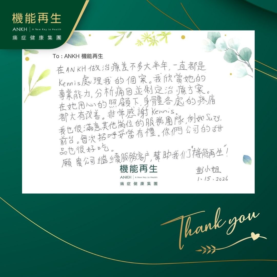在ANKH做理療差不多大半年,一直都是理療師處理我的個案。我欣賞她的專業能力,分析痛因並制定理療方案。 在她用心的照顧下,身體各處的疼痛都大有改善。非常感謝她。 我也很滿意其他崗位的服務團隊,例如前台。每次招呼妥當有禮。你們公司的甜品也很好吃。 願 貴公司繼續服務客戶,幫助我們「機能再生」。